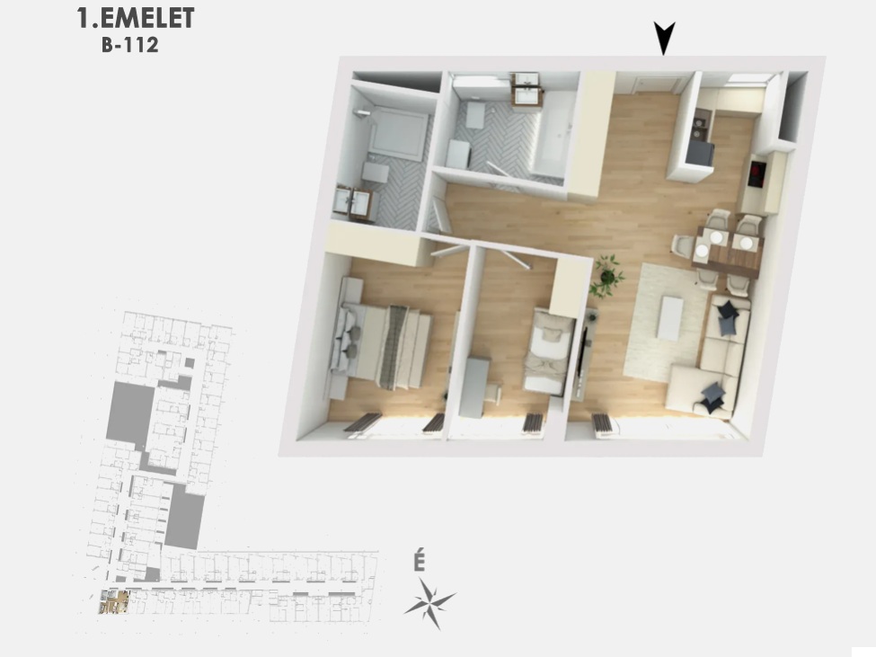 Eladásra kínálunk, egy első emeleti 64 nm-es, nappali + 2 hálószobás, déli fekvésű lakást, Budapest egyik legkeresettebb részén, a XIII. kerület szívében, közvetlenül a Marina-part szomszédságában, pár lépésre a Duna-parttól épülő, Wave Life Residenceben.